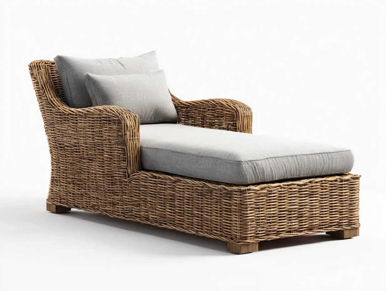 Lettino prendisole da esterno ideale per giardino terrazza e veranda. La struttura in rattan intrecciato con seduta imbottita e braccioli laterali offre una soluzione confortevole e stabile per il relax quotidiano all aperto con un aspetto naturale e armonioso.
