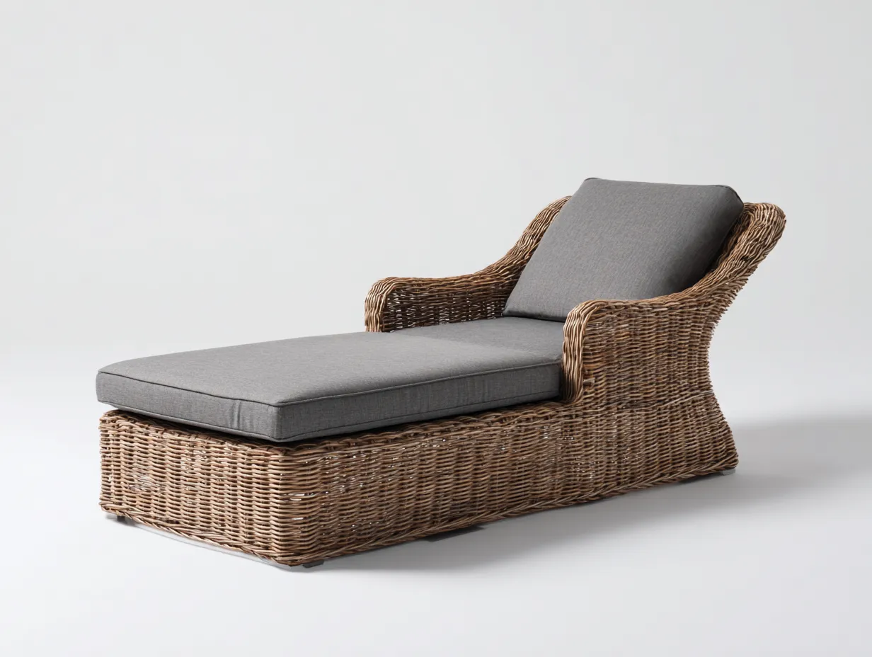 Lettino prendisole da esterno progettato per ambienti come giardino terrazza e veranda. La struttura in rattan intrecciato abbinata alla seduta imbottita offre una soluzione confortevole e funzionale per il relax quotidiano con un aspetto naturale e armonioso.