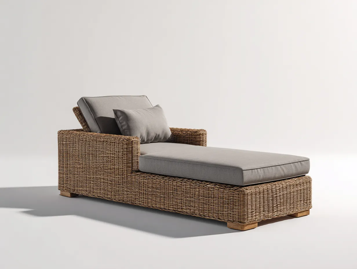 Lettino prendisole da esterno pensato per giardino terrazza e veranda. La struttura in rattan intrecciato con seduta imbottita offre una soluzione pratica e confortevole per momenti di relax all aperto con un'estetica naturale ed equilibrata.