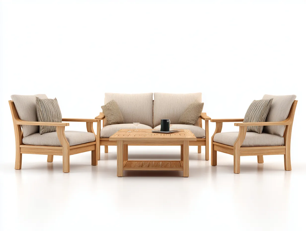 Le sedute e il tavolino sono realizzati in legno con finitura naturale. La struttura è progettata per garantire stabilità e un utilizzo adeguato in ambienti esterni.