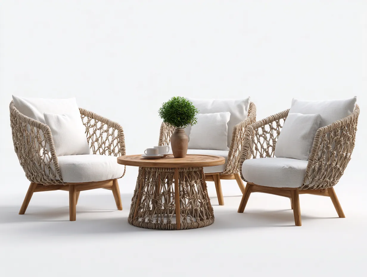 Il set offre sedute stabili e confortevoli abbinate a un piano d'appoggio centrale pratico. Il design intrecciato favorisce la ventilazione e un utilizzo quotidiano all'aperto.